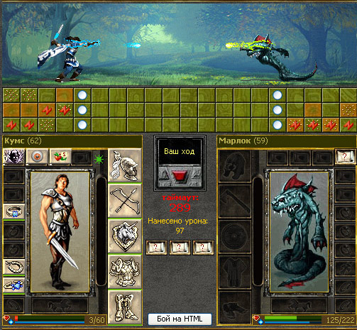 Бои проходят в два этапа: сначала дальний бой, в котором сражающиеся обмениваются магическими ударами, а затем ближний, где сражение уже идет врукопашную. Победа зависит от навыков персонажа, умения тактически мыслить и просчитывать действия противника наперед. Кроме боев на Арене, можно участвовать в клановых, хаотических, межрасовых боях, битвах между городами и между светлыми и темными волшебниками. Миссии – это игровые события, в которых можно принять участие. Например, отбить город у врага или разрушить локацию, на которой обитают чудовища.